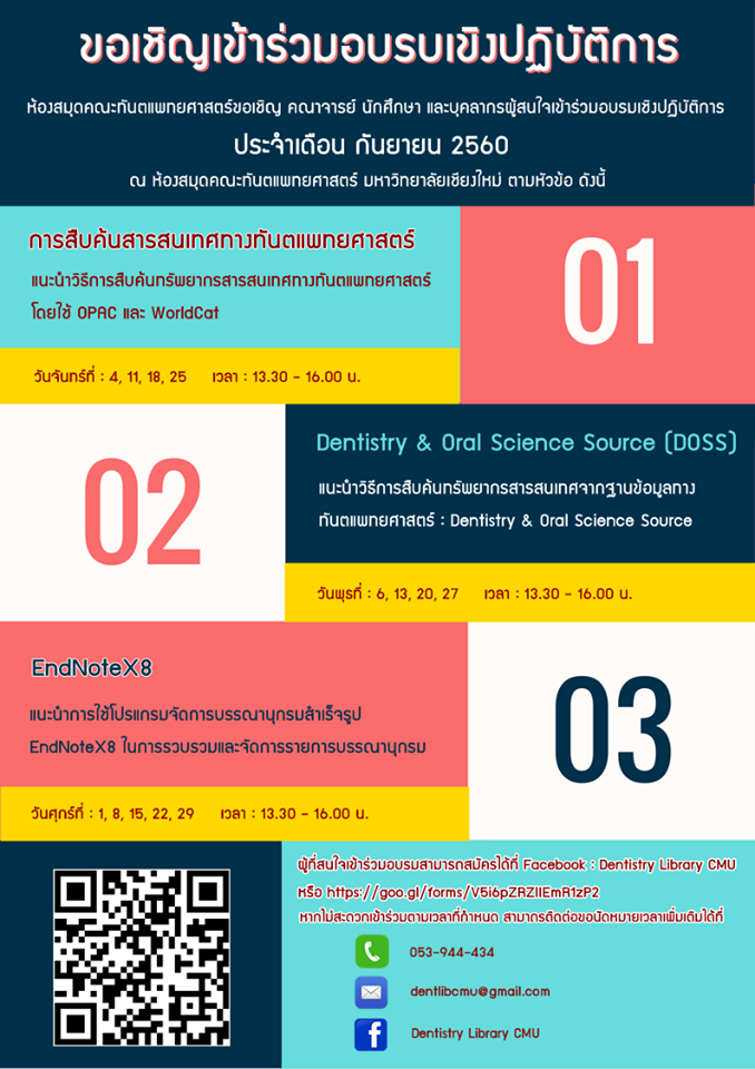 ขอเชิญเข้าร่วมอบรมเชิงปฏิบัติการ : การสืบค้นสารสนเทศทางทันตแพทยศาสตร์และการจัดการบรรณานุกรม ประจำเดือน กันยายน 2560