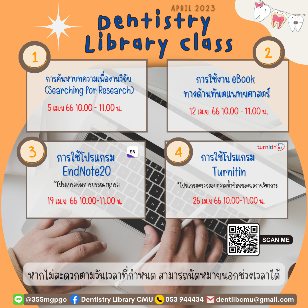 Dentistry Library Class ประจำเดือนเมษายน 2566 มาแล้วค่ะ ลงทะเบียนได้เลย ที่ https://forms.gle/n5TMoaMTujnwAwtH6 หากไม่สะดวกตามวันและเวลาที่กำหนด สามารถนัดหมายนอกตารางได้นะคะ