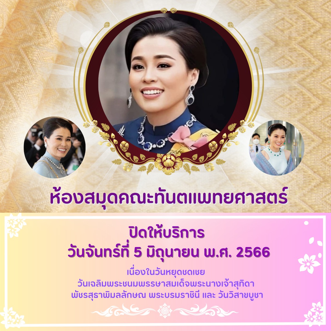 ห้องสมุดปิดให้บริการ วันจันทร์ที่ 5 มิถุนายน พ.ศ. 2566 เนื่องในวันหยุดชดเชย วันเฉลิมพระชนมพรรษาสมเด็จพระนางเจ้าสุทิดา พัชรสุธาพิมลลักษณ พระบรมราชินี และวันวิสาขบูชา