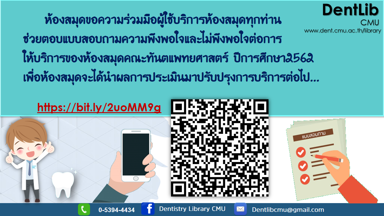 ห้องสมุดขอความร่วมมือผู้ใช้บริการห้องสมุดทุกท่านช่วยตอบแบบสอบถามความพึงพอใจและไม่พึงพอใจต่อการให้บริการของห้องสมุดคณะทันตแพทยศาสตร์ ปีการศึกษา2562