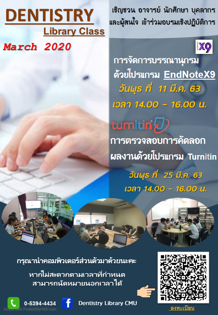 ารางอบรม Library Dentistry Class ประจำเดือนมีนาคม 2563 ใครที่เคยเรียนแล้วกลับมาเรียนซ้ำอีก เพื่อทบทวนความจำได้นะคะ จะมาเป็นกลุ่มหรือมาคนเดียวก็สามารถลงทะเบียนได้เลยที่ https://bit.ly/3ctwDQZ ถ้าไม่สะดวกตามวันเวลาที่กำหนด สามารถนัดหมายนอกเวลาได้ที่ 053-944434 หรือ Inbox มาได้เลยนะคะ **อย่าลืมนำคอมพิวเตอร์โน๊คบุ๊คมาด้วยนะคะ