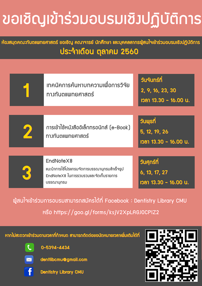 ขอเชิญเข้าร่วมอบรมเชิงปฏิบัติการ : การสืบค้นสารสนเทศทางทันตแพทยศาสตร์และการจัดการบรรณานุกรม ประจำเดือน ตุลาคม 2560