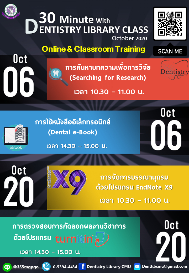 30 Minute with Dentistry Library Class ประจำเดือน ตุลาคม 2563 สำหรับเดือนนี้ห้องสมุดให้บริการเพื่อตอบโจทย์สำหรับผู้ใช้ที่อยากเข้าร่วมอบรม แต่มีเวลาจำกัด โดยสามารถเลือกรูปแบบการอบรมได้ ทั้ง 2 รูปแบบทั้งแบบเหมือนเดิม ทั้งแบบ