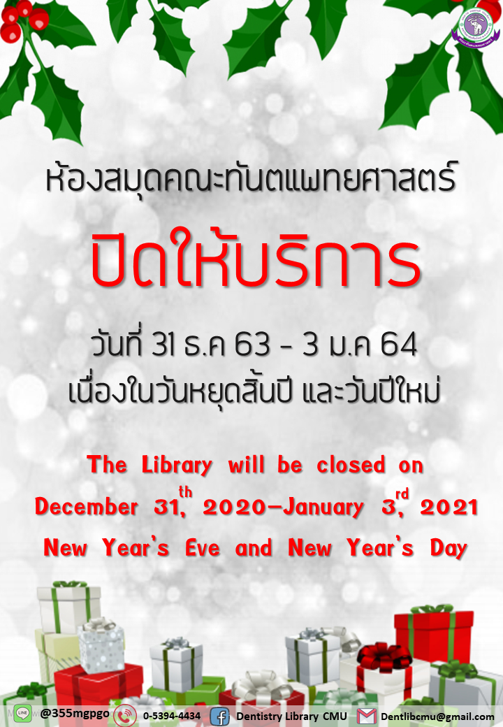 ห้องสมุดปิดให้บริการในวันที่ 31 ธันวาคม 2563 ถึง 3 มกราคม 2564 เนื่องในวันสิ้นปี และวันขึ้นปีใหม่