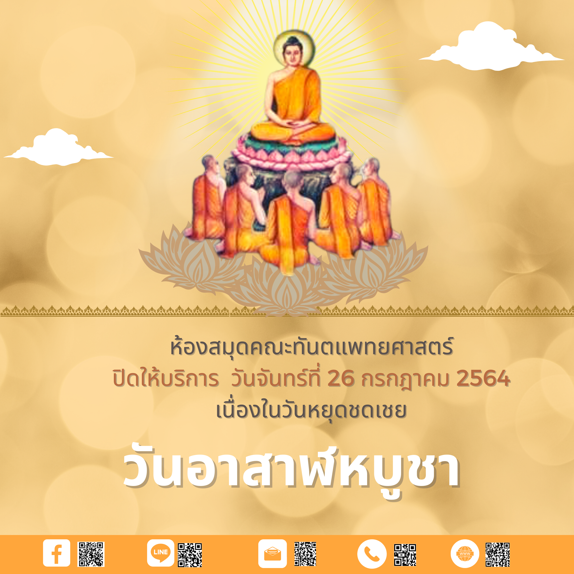 ห้องสมุดคณะทันตแพทยศาสตร์ ปิดให้บริการในวันจันทร์ ที่ 26 กรกฎาคม 2564 เนื่องในวันหยุดชดเชย วันอาสาฬหบูชา
