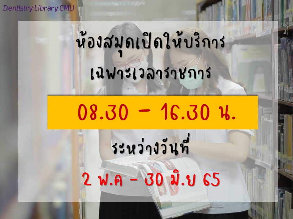 ห้องสมุดเปิดให้บริการเฉพาะเวลาราชการ ตั้งแต่ 8.30-16.30 น. ระหว่างวันที่ 2 พ.ค - 30 มิ.ย 65