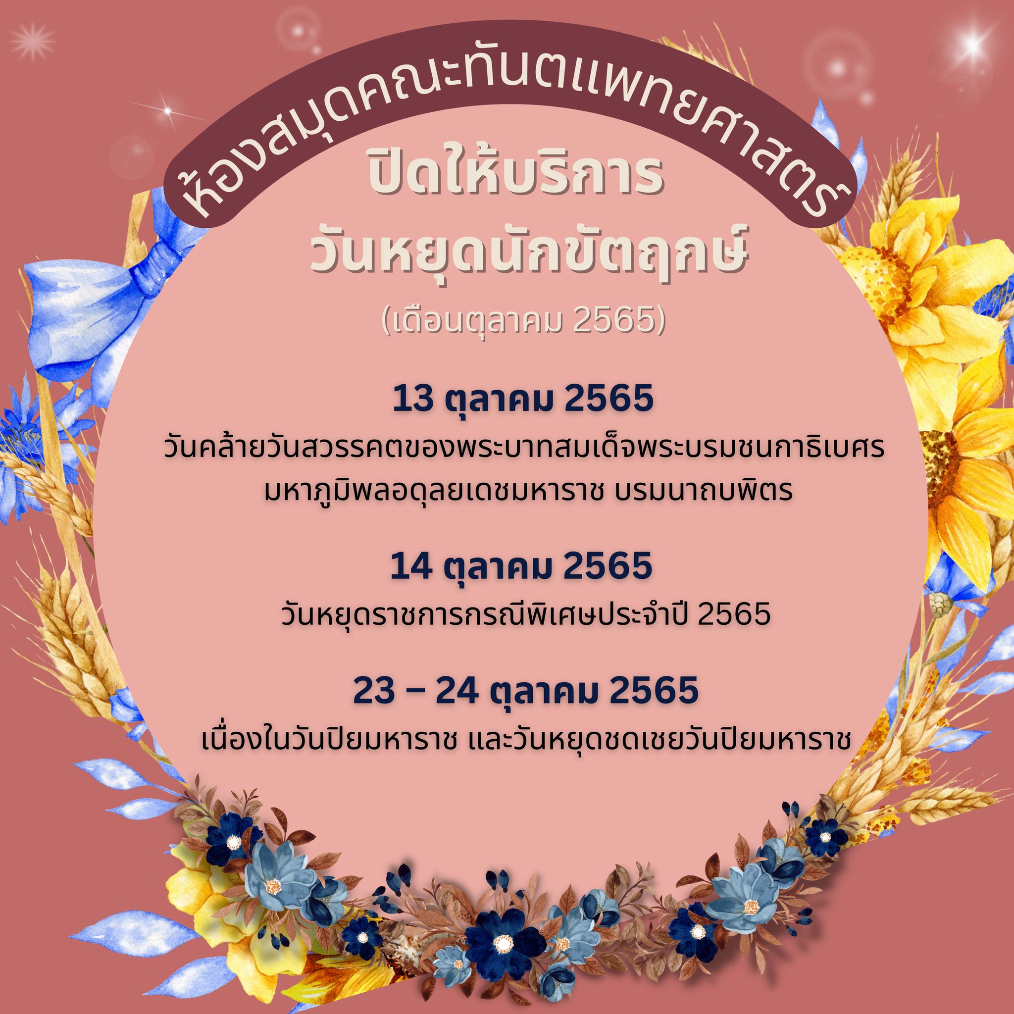 ห้องสมุดคณะทันตแพทยศาสตร์ ปิดให้บริการ ในวันที่13 -14 ตุลาคม 2565 และ 23 – 24 ตุลาคม 2565