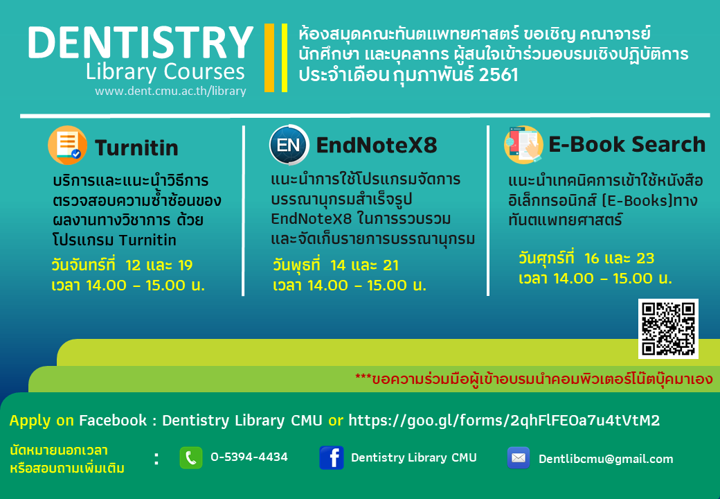 ห้องสมุดคณะทันตแพทยศาสตร์ ขอเชิญ คณาจารย์ นักศึกษา และบุคลากรผู้สนใจเข้าร่วมอบรมเชิงปฏิบัติการ : "DENTISTRY Library Courses" การตรวจสอบความซ้ำซ้อนของผลงานทางวิชาการ การจัดการบรรณานุกรมสำเร็จรูปด้วยโปรแกรม EndNoteX8 และเทคนิคการเข้าใช้หนังสืออิเล็กทรอนิกส์ (E-Books) ทางทันตแพทยศาสตร์ ประจำเดือน กุมภาพันธ์ 2561 สามารถลงชื่อเข้าร่วมอบรมได้ที่