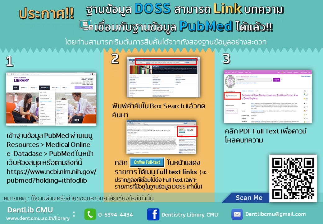 ประกาศ!! ฐานข้อมูล DOSS สามารถ Link บทความ เชื่อมกับฐานข้อมูล PubMed ได้แล้ว!! โดยท่านสามารถเริ่มต้นการสืบค้นได้จากทั้งสองฐานข้อมูลอย่างสะดวก ไม่ว่าจะค้นฐานข้อมูลไหนก็ดาวน์โหลดบทความได้