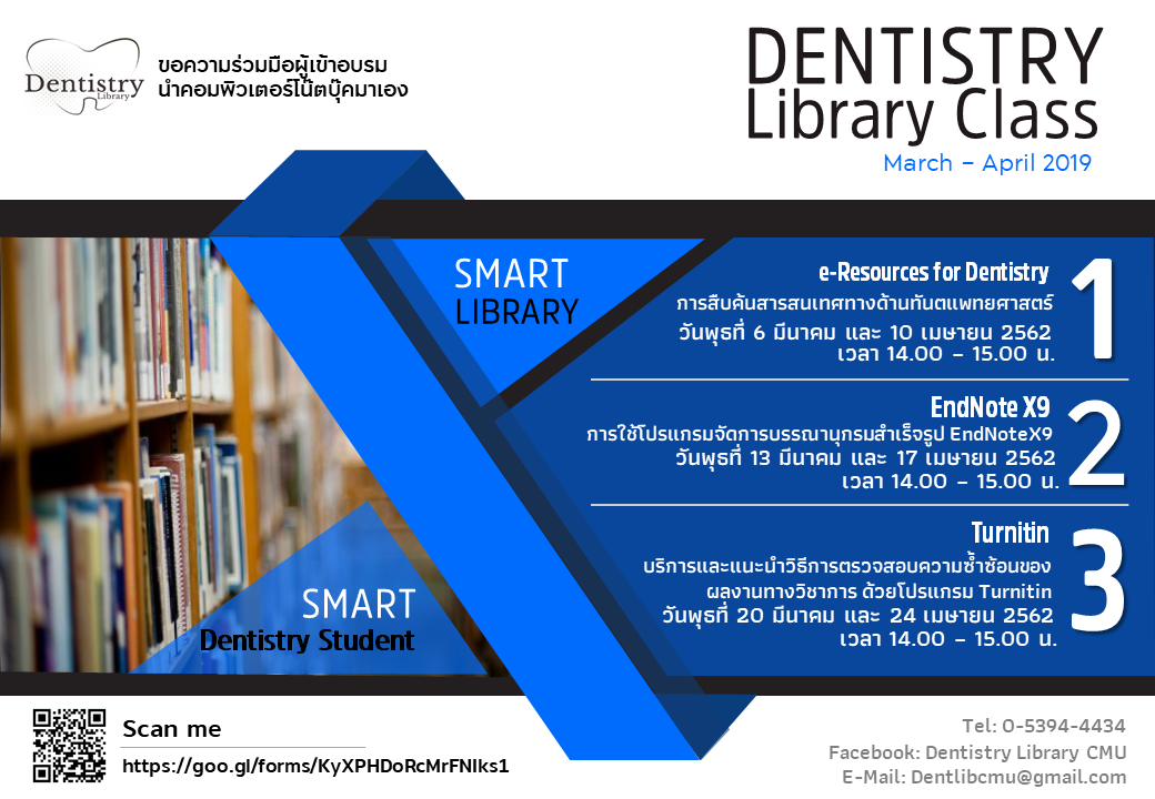 ชิญชวนเข้าร่วมอบรมเชิงปฏิบัติการ : "DENTISTRY Library Class" สืบค้นสารสนเทศอิเล็กทรอนิกส์ทางทันตแพทยศาสตร์ การจัดการบรรณานุกรมด้วยโปรแกรมสำเร็จรูป EndNoteX9 และการตรวจสอบความซ้ำซ้อนของผลงานทางวิชาการ ประจำเดือนมีนาคม - เมษายน 2562