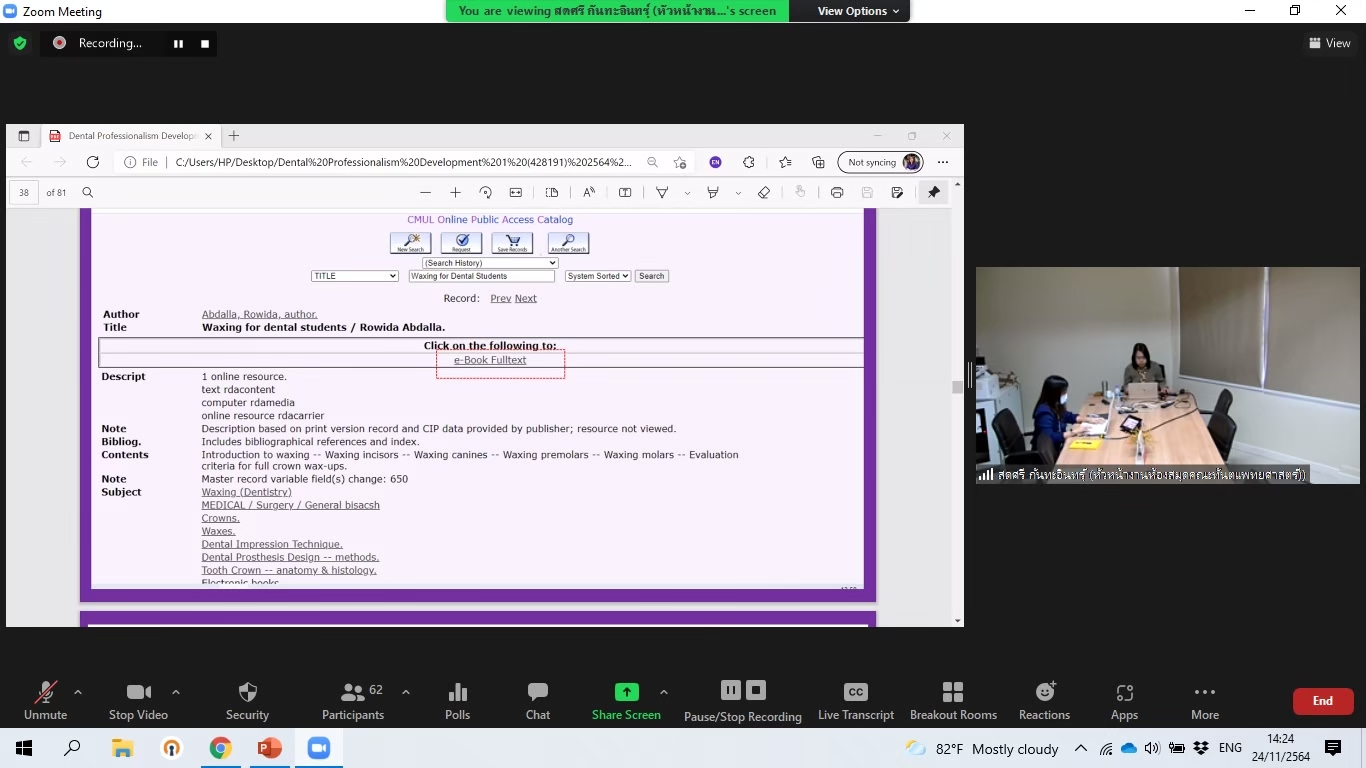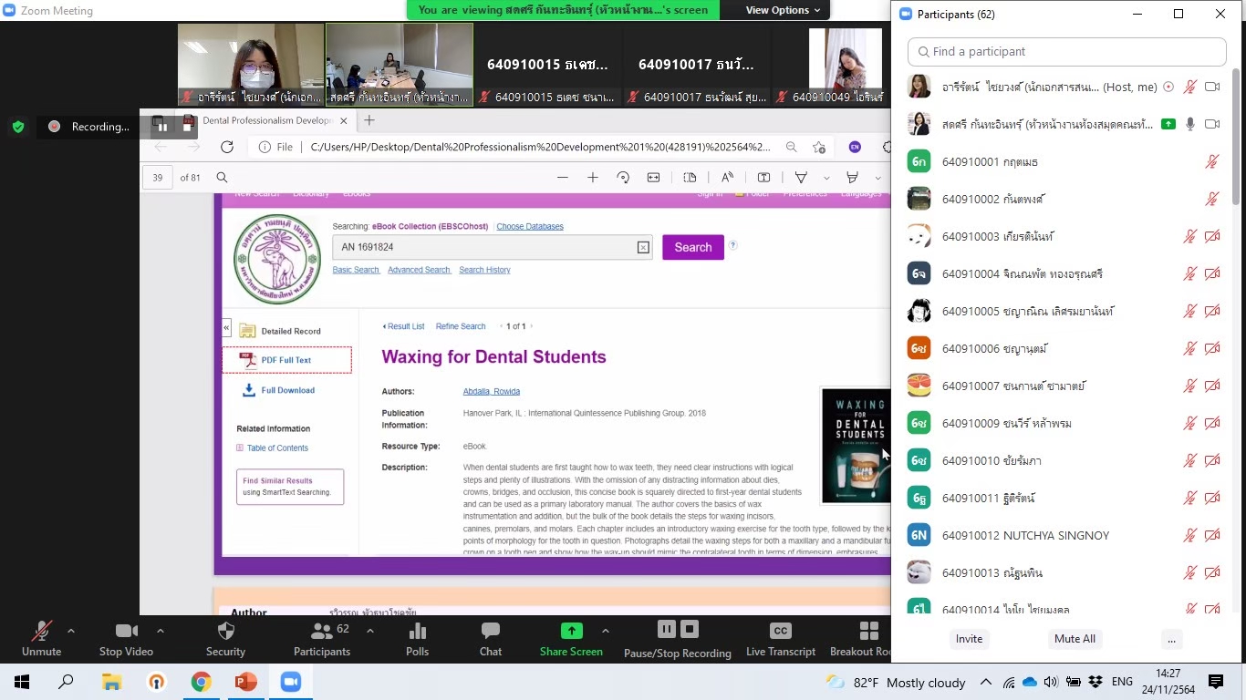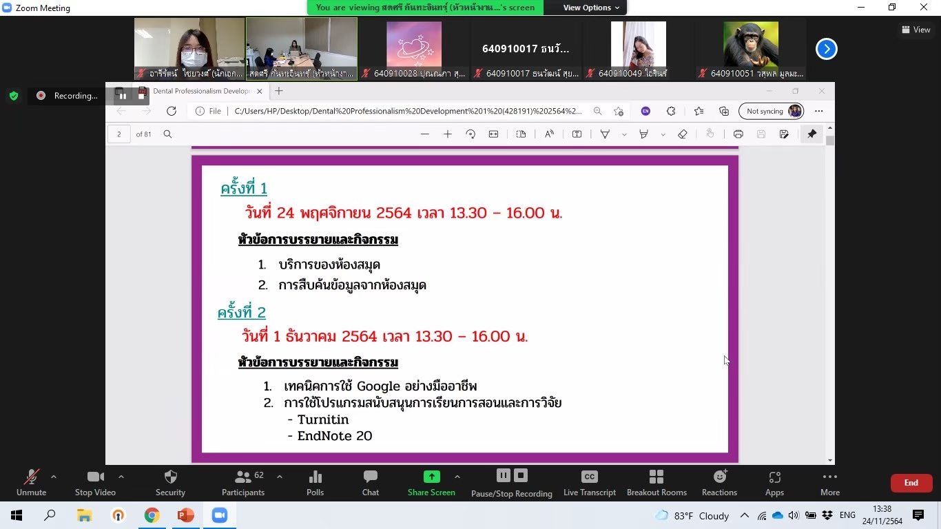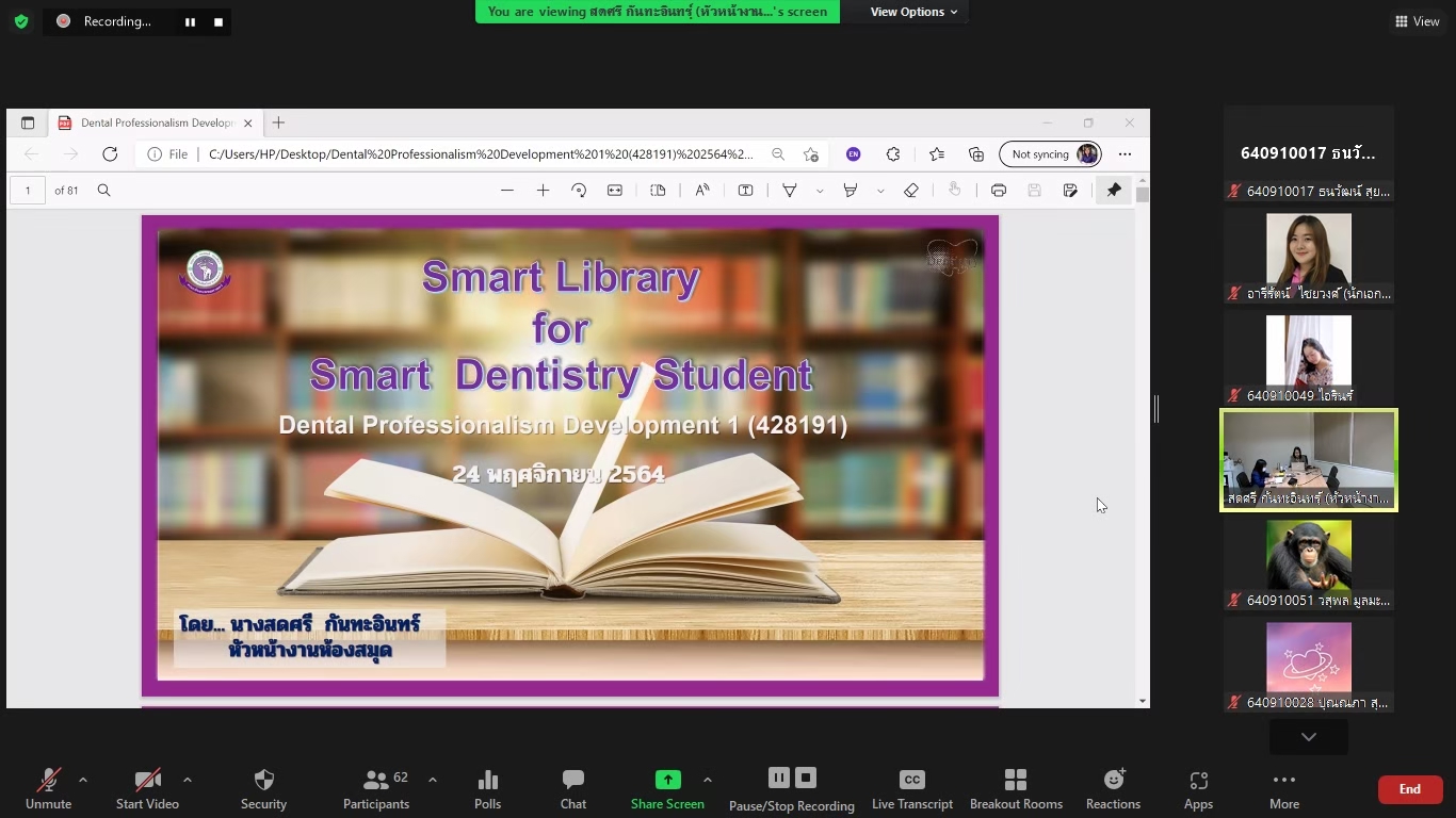 ห้องสมุดสอนการสืบค้นข้อมูลและการอ้างอิงในกระบวนวิชา Dental Professionalism Development 1 ผ่านโปรแกรม Zoom Meeting