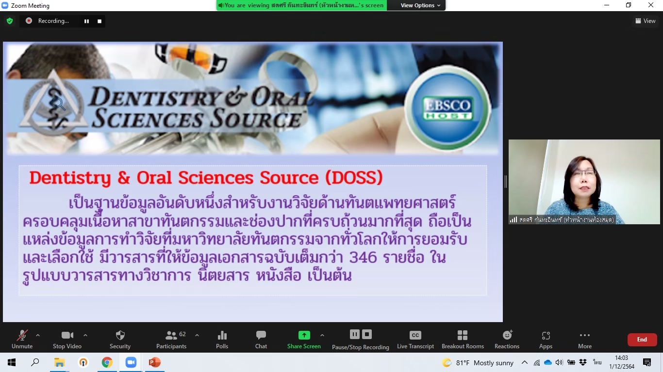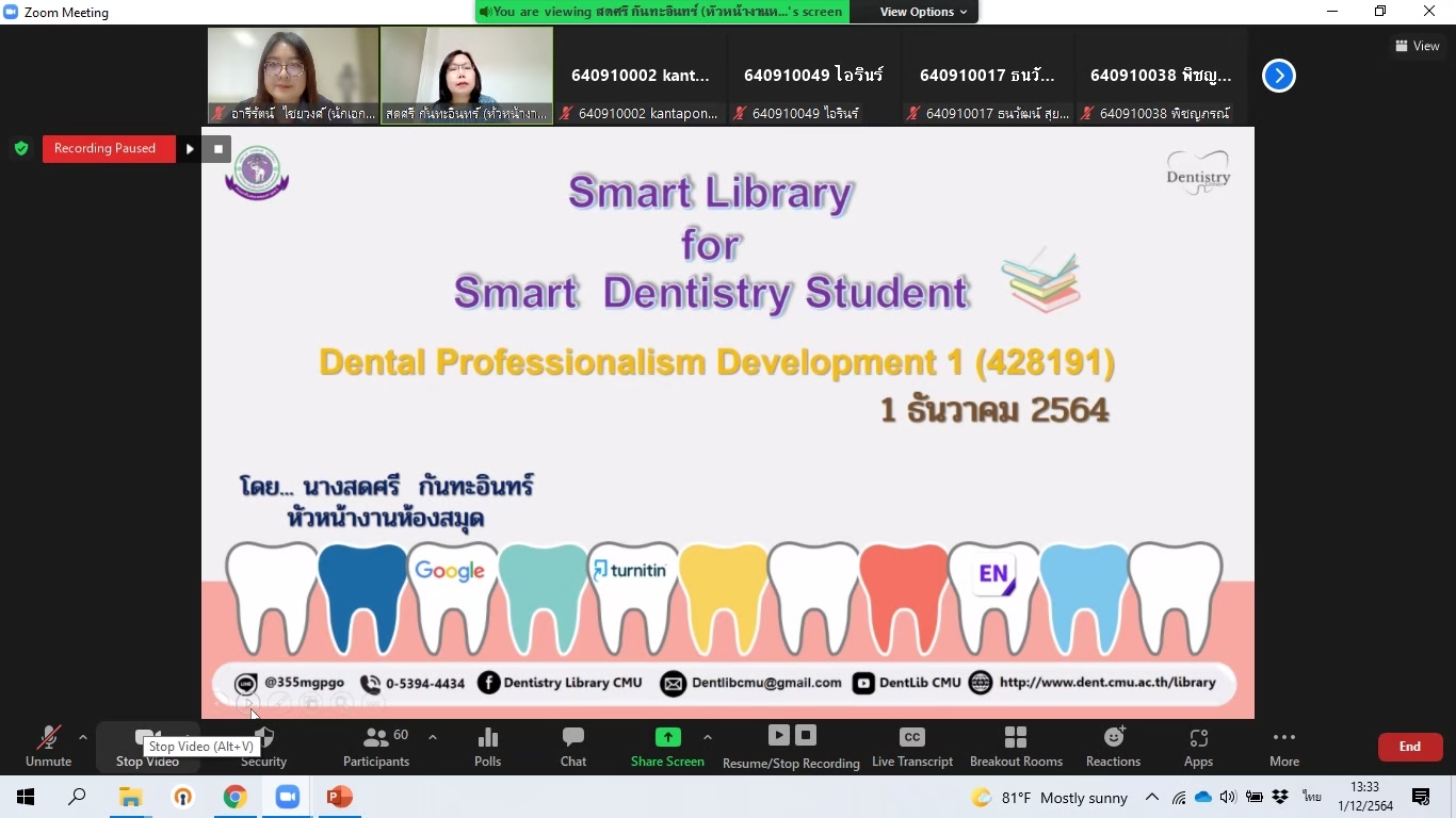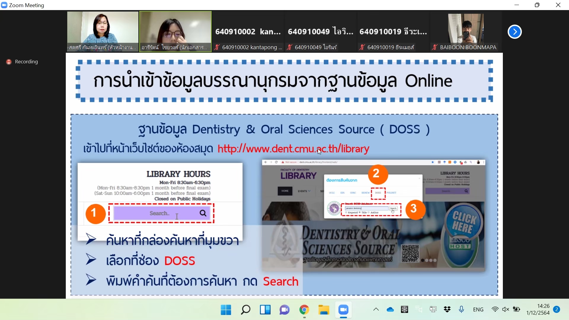 ​ห้องสมุดสอนการสืบค้นข้อมูลและการอ้างอิงในกระบวนวิชา Dental Professionalism Development 1 ผ่านโปรแกรม Zoom Meeting