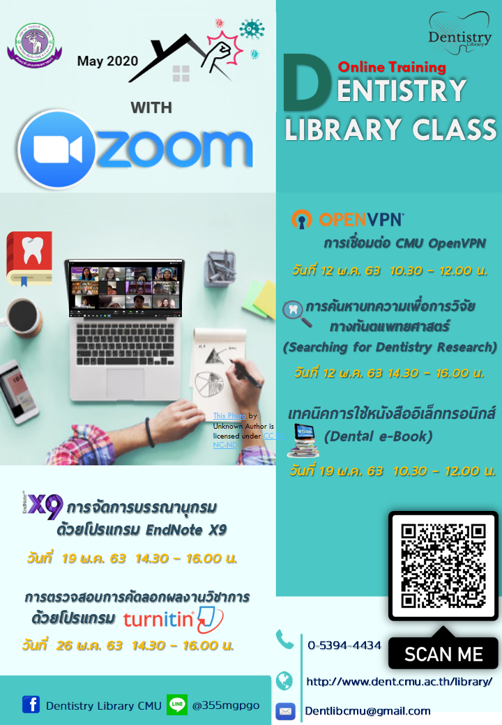 ถึงแม้ว่า สถานการณ์การแพร่ระบาดของเชื้อ COVID-19 จะทำให้ห้องสมุดต้องปิดพื้นที่ให้บริการ แต่เราก็จะไม่มีวันหยุดให้บริการนะคะ ห้องสมุดขอเชิญเข้าร่วมอบรมเชิงปฏิบัติการ Dentistry Library Class ประจำเดือนพฤษภาคม 2563 With Zoom meeting เรียนออนไลน์ได้ทุกที่ทุกเวลา ไม่จำกัดจำนวนผู้เรียน จะมาเดี่ยวหรือมาเป็นกลุ่มก็สามารถเรียนได้ คลิกลงทะเบียนได้เลย ที่ https://cmu.to/UPnKK