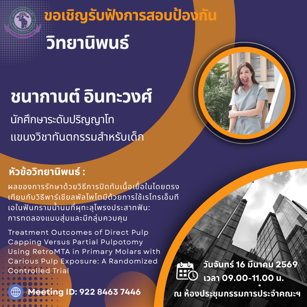 ขอเชิญรับฟังการสอบป้องกันวิทยานิพนธ์ของ ชนากานต์ อินทะวงศ์ นักศึกษาระดับปริญญาโท แขนงวิชาทันตกรรมสำหรับเด็ก