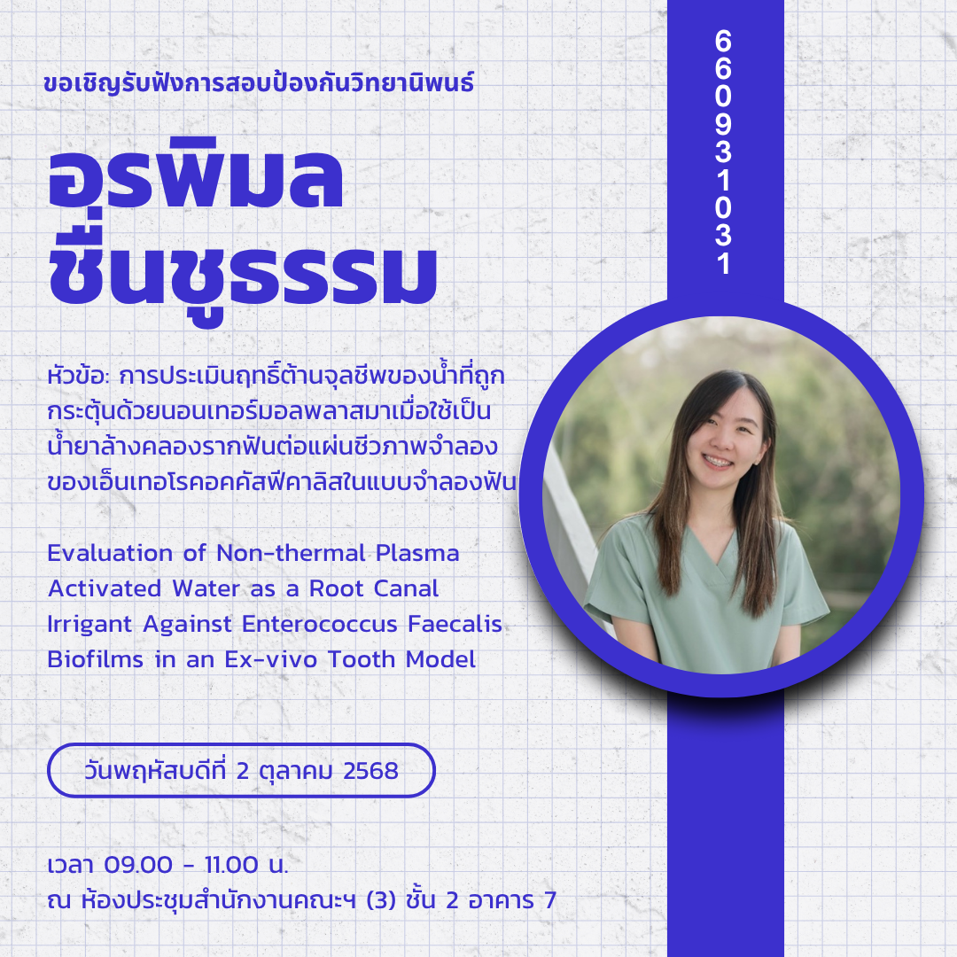 หัวข้อ: การประเมินฤทธิ์ต้านจุลชีพของน้ำที่ถูกกระตุ้นด้วยนอนเทอร์มอลพลาสมาเมื่อใช้เป็นน้ำยาล้างคลองรากฟันต่อแผ่นชีวภาพจำลองของเอ็นเทอโรคอคคัสฟีคาลิสในแบบจำลองฟัน