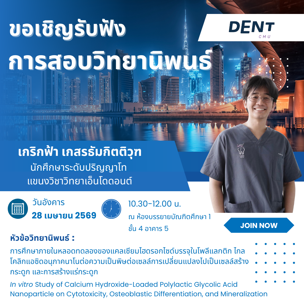 คณะทันตแพทยศาสตร์ มหาวิทยาลัยเชียงใหม่ ขอเชิญผู้ที่สนใจเข้าร่วมรับฟังการสอบวิทยานิพนธ์ของ เกริกฟ้า เกสรรัมกิตติวุท นักศึกษาระดับปริญญาโท แขนงวิชาวิทยาเอ็นโดดอนต์