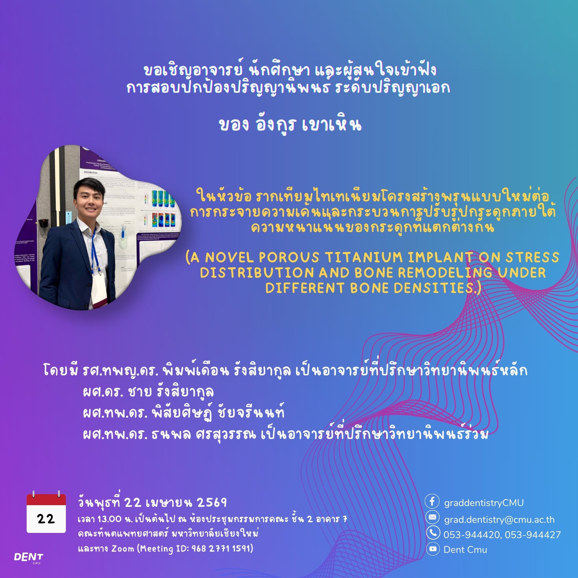 คณะทันตแพทยศาสตร์ มหาวิทยาลัยเชียงใหม่ ขอเชิญอาจารย์ นักศึกษา และผู้ที่สนใจทุกท่าน เข้าร่วมรับฟังการสอบปกป้องปริญญานิพนธ์ของ นายอังกูร เขาเหิน