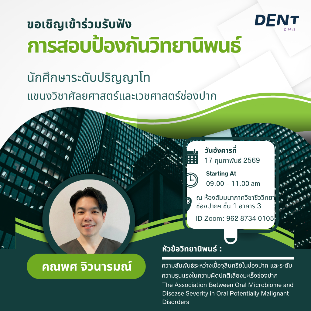 ขอเชิญเข้าร่วมรับฟังการสอบป้องกันวิทยานิพนธ์ของ คณพศ จิวนารมณ์ นักศึกษาระดับปริญญาโท แขนงวิชาศัลยศาสตร์และเวชศาสตร์ช่องปาก