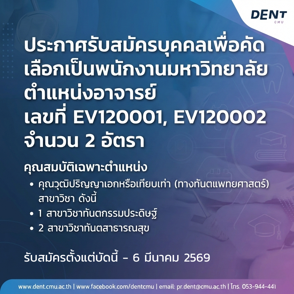 คุณสมบัติเฉพาะตำแหน่ง คุณวุฒิปริญญาเอกหรือเทียบเท่า (ทางทันตแพทยศาสตร์) สาขาวิชา ดังนี้