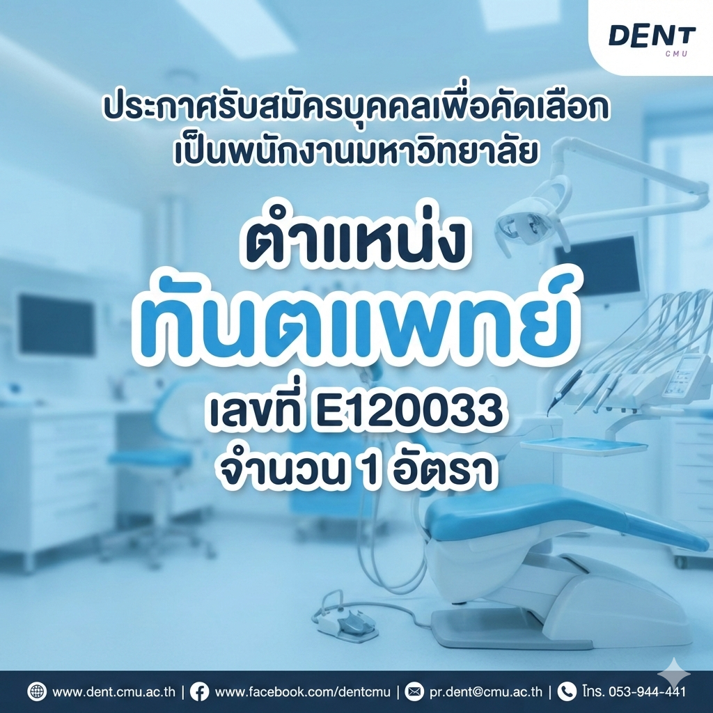 ประกาศรับสมัครบุคคลเพื่อคัดเลือกเป็นพนักงานมหาวิทยาลัย ตำแหน่ง ทันตแพทย์ เลขที่ E120033 จำนวน 1 อัตรา