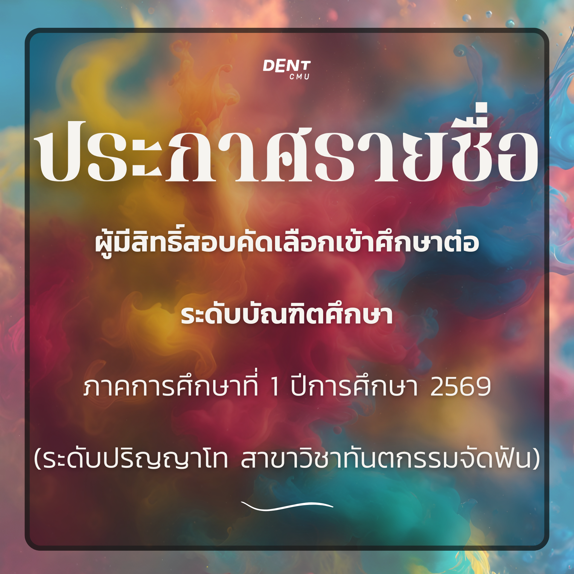 ประกาศรายชื่อผู้มีสิทธิ์สอบคัดเลือกเข้าศึกษาต่อระดับบัณฑิตศึกษา ภาคการศึกษาที่ 1 ปีการศึกษา 2569 (ระดับปริญญาโท สาขาวิชาทันตกรรมจัดฟัน)