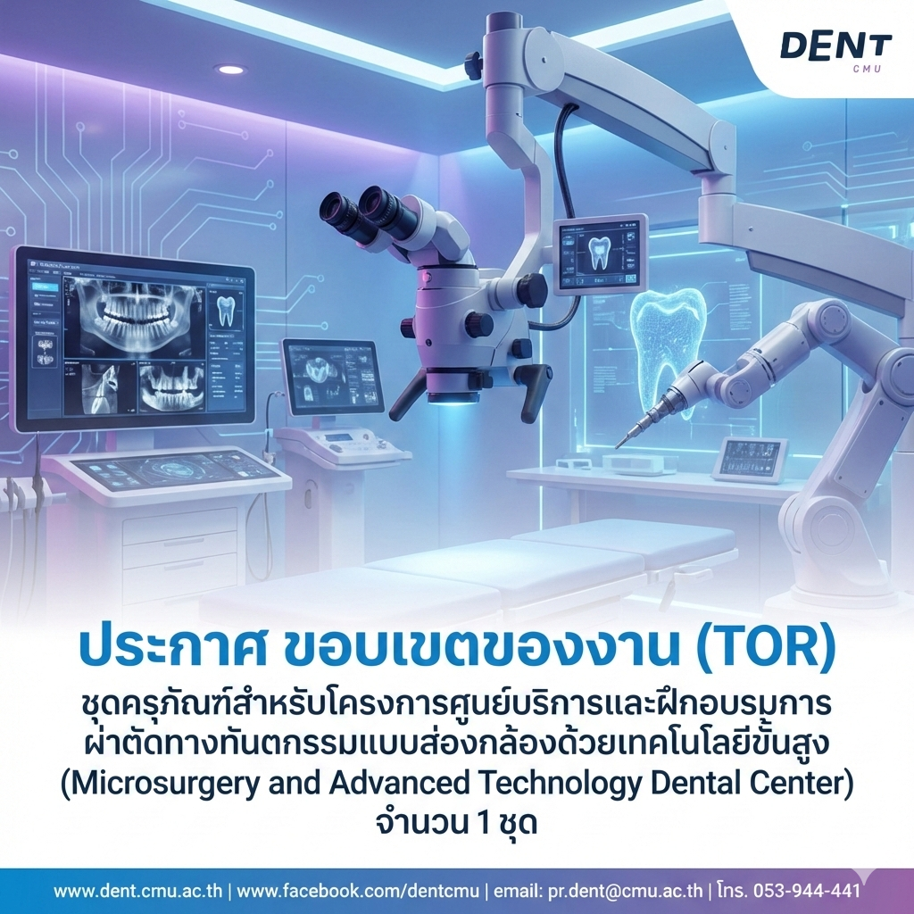 ประกาศ ขอบเขตของงาน (TOR) ชุดครุภัณฑ์สำหรับโครงการศูนย์บริการและฝึกอบรมการผ่าตัดทางทันตกรรมแบบส่องกล้องด้วยเทคโนโลยีขั้นสูง (Microsurgery and Advanced Technology Dental Center) จำนวน 1 ชุด