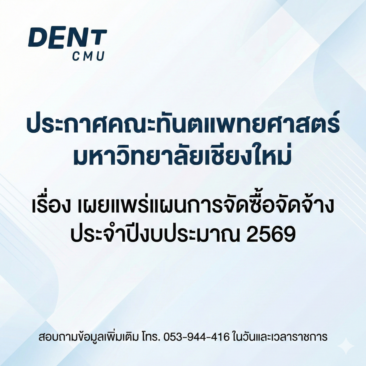 ประกาศคณะทันตแพทยศาสตร์ มหาวิทยาลัยเชียงใหม่ เรื่อง เผยแพร่แผนการจัดซื้อจัดจ้าง ประจำปีงบประมาณ 2569