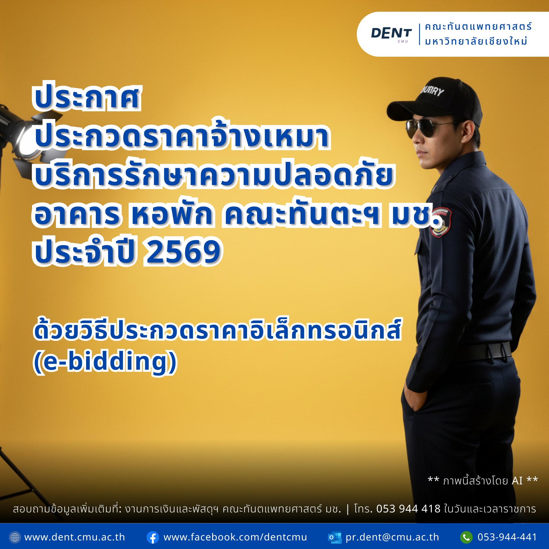 ประกาศ ประกวดราคาจ้างเหมา บริการรักษาความปลอดภัยอาคารที่ทำการ และหอพักนักศึกษา บุคลากร คณะทันตแพทยศาสตร์ มหาวิทยาลัยเชียงใหม่ ประจำปี 2569 ด้วยวิธีประกวดราคาอิเล็กทรอนิกส์ (e-bidding)