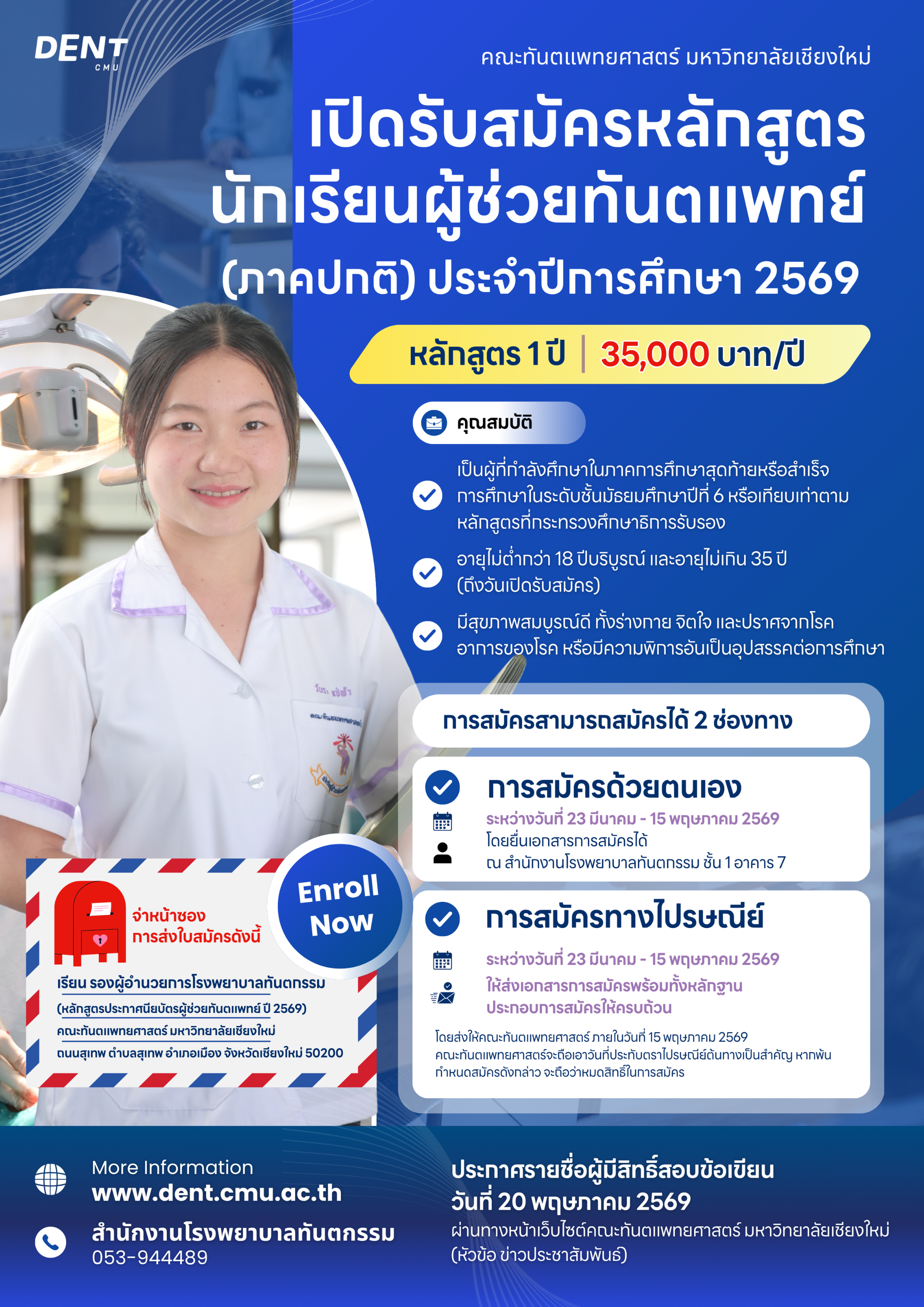 คณะทันตแพทยศาสตร์ มหาวิทยาลัยเชียงใหม่ ขอเชิญชวนผู้ที่สนใจสมัครเข้าศึกษาต่อ ในหลักสูตรนักเรียนผู้ช่วยทันตแพทย์ (ภาคปกติ) ประจำปีการศึกษา 2569 หลักสูตร 1 ปี (ค่าธรรมเนียมการศึกษา 35,000 บาท/ปี) เพื่อก้าวเข้าสู่วิชาชีพผู้ช่วยทันตแพทย์อย่างมั่นใจ